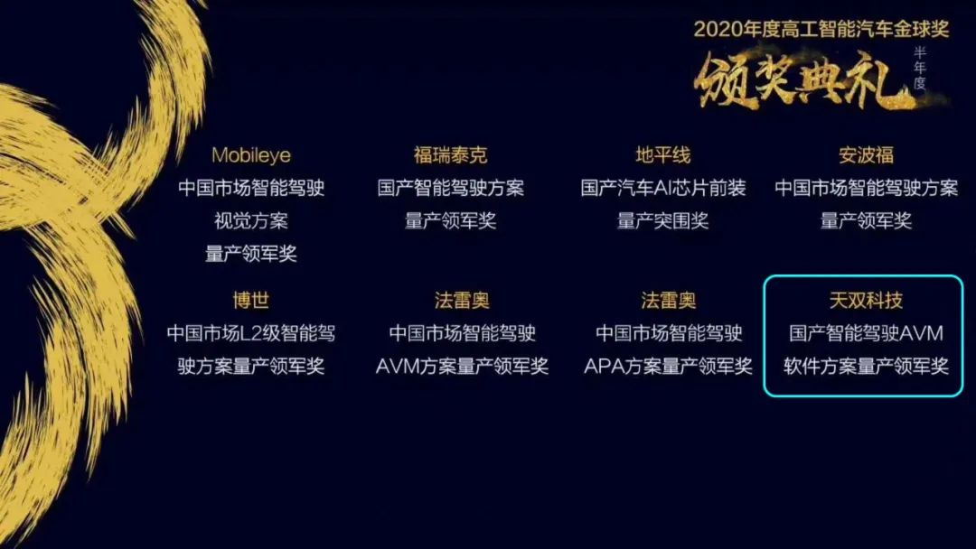 7月24-25日,2020(第十届)高工智能汽车开发者大会在上海举行,在高工智能汽车金球奖颁奖典礼上,天双科技荣获“国产智能驾驶AVM软件方案”量产领军奖。